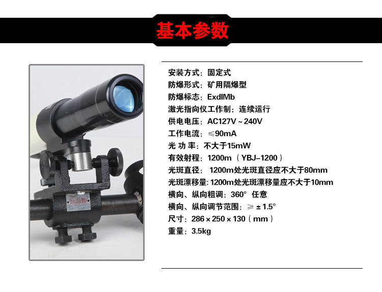 YBJ矿用隔爆型激光指向仪是集电子、光学、精密机械等技术为一体的仪器。具有外形美观、体积小、重量轻、防爆等特点。仪器安装采用固定式,通过悬挂组可快速固定在锚杆上。仪器可在360°范围任意粗调,微调准确;调节方便,制动可靠。产品采用自主研发的光学系统,可采用红、绿两种光源,光斑大小、射程满足矿下施工需求。仪器采用交直流转换电源模块,交流宽电压AC80V~AC245V供电,具有保护功能。